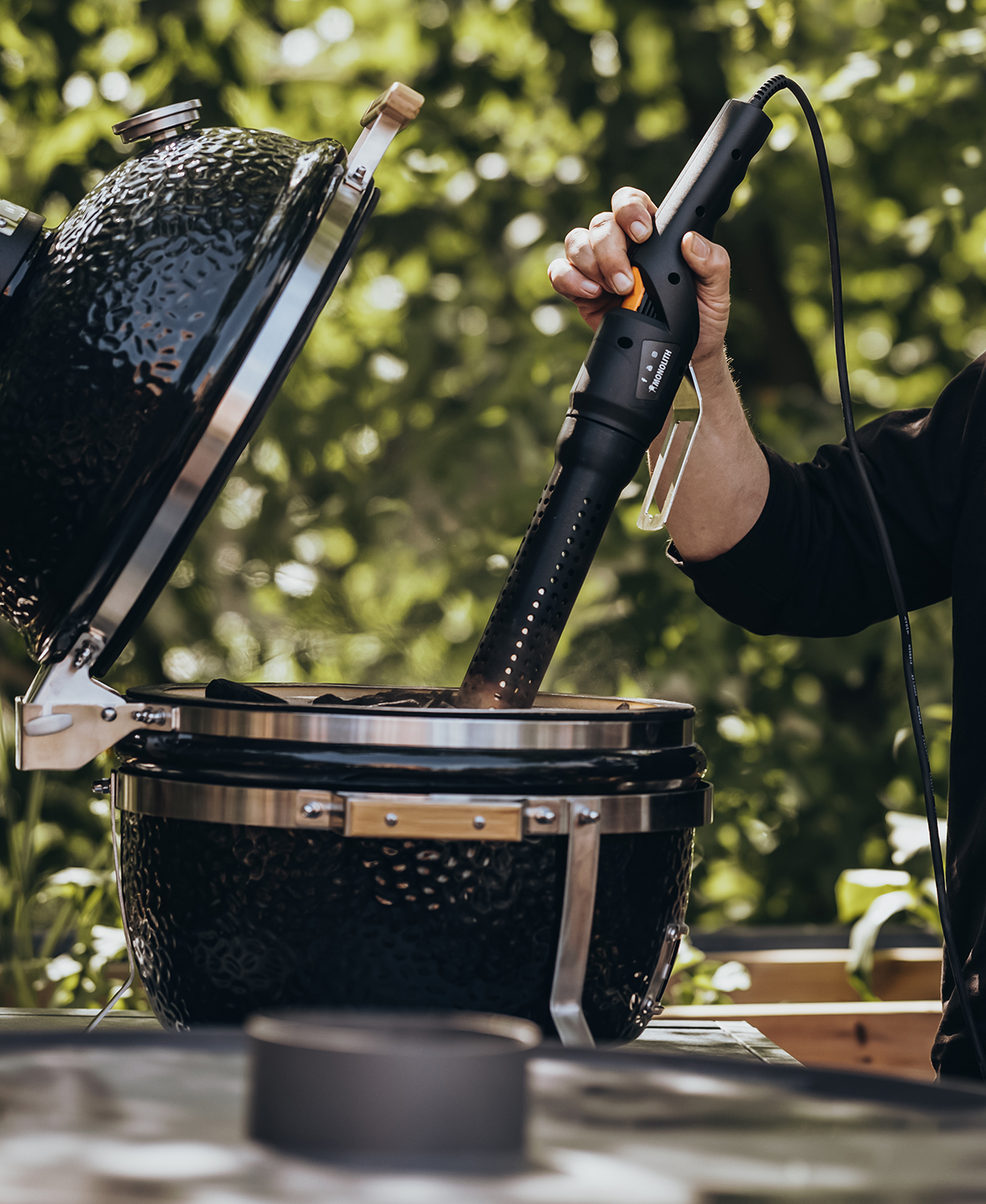 Le Mono Lighter de MONOLITH, est un allume-barbecue électrique, pour enflammer le charbon de bois en quelques minutes. Grâce à son puissant ventilateur à air chaud d’une capacité de 2000 watts, les charbons s’allument en quelques secondes avec de l’air chauffé à 600 degrés. Cet allume-barbecue ne nécessite pas de flamme ouverte, ce qui rend l’allumage plus sûr, car aucun produit chimique n’est nécessaire. Ceci est particulièrement important pour les barbecues en céramique, car la céramique à pores ouverts peut absorber des produits chimiques et influencer le goût de la viande. C’est pourquoi il est recommander à tout propriétaire d’un barbecue en céramique d’ utiliser un allume-feu naturel ou électrique, et le Mono Lighter se révèle ici être un allume-feu idéal.